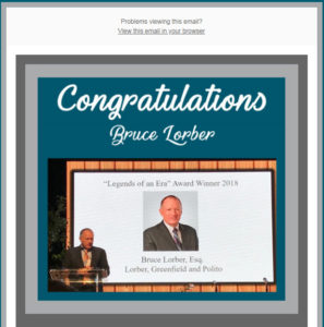 We are happy to announce that Bruce Lorber was honored with the prestigious West Coast Casualty Legends of an Era Award for 2018. This award recognizes his career achievements and professional success representing developers in construction litigation. His family was present to share in the ceremony and his comments shared the appreciation for the recognition as well as the individuals of the LGP firm who have contributed to the firm’s success. This award was very well-deserved and everyone was excited to see the legal community express its support by giving him the Legends Award. Click here to read the article